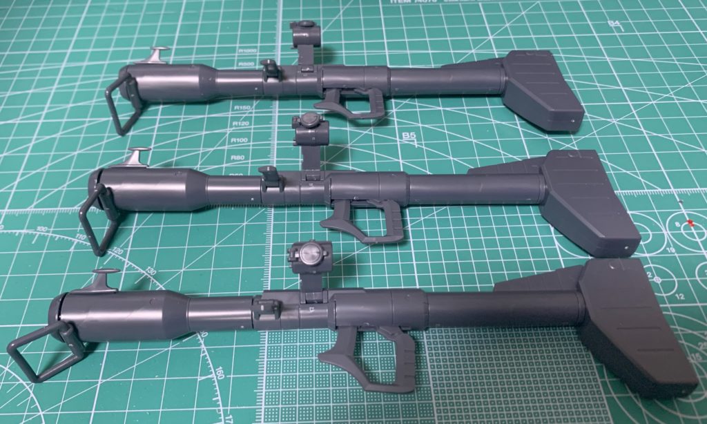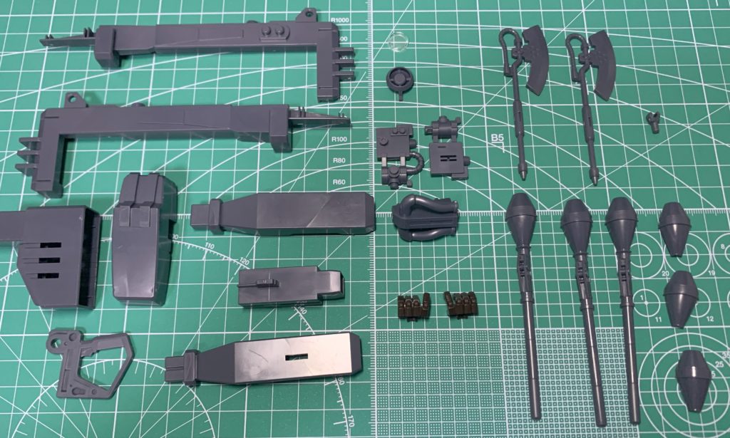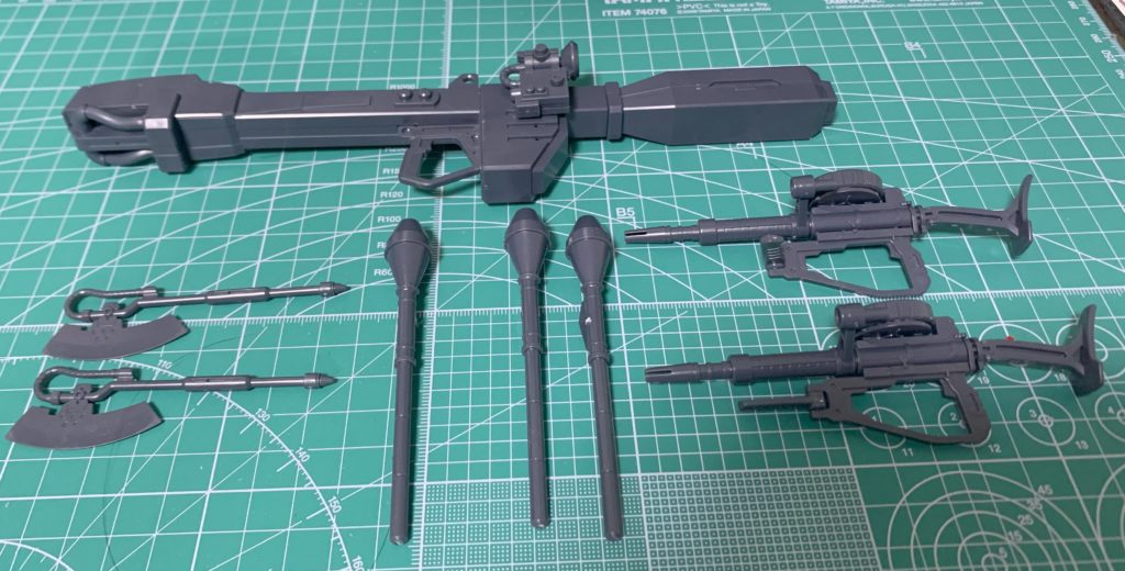上:ビーム・バズーカ 1丁 左から:ヒート・ホーク 2本 シュツルム・ファウスト 3本 ザク・マシンガン 2丁